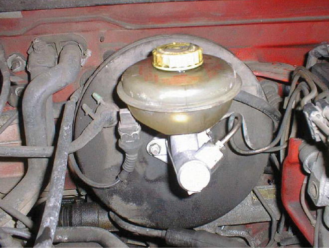 • eśli zbiorniczek jest zamocowany za pomocą zaczepów mocujących lub zawleczek do pompy hamulcowej, można zastosować ciśnienia 1–2,2 bary z zachowaniem ostrożności, by uniknąć rozłączenia zbiorniczka od pompy hamulcowej.