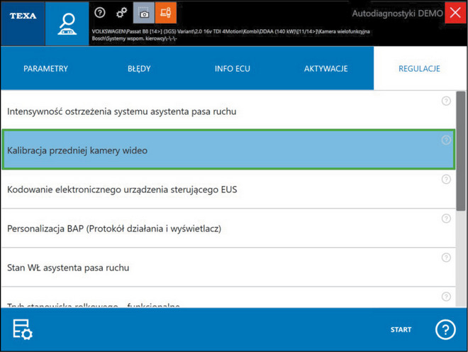 Po zakończeniu procedury pozycjonowania zestawu względem pojazdu można przejść do fazy kalibracji przedniej kamery. Odpowiednią procedurę wybiera się z zakładki „Regulacje” po połączeniu się ze sterownikiem pojazdu (rys. 2).