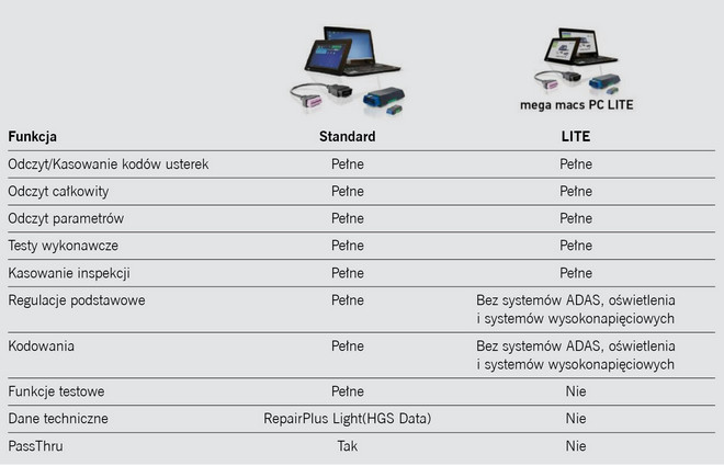Zawartość aplikacji mega macs PC LITE w stosunku do wersji pełnej została pomniejszona o diagnostykę systemów ADAS, oświetlenia (światła adaptacyjne, LED, matryce) oraz systemów wysokonapięciowych, zachowując przy tym pełną funkcjonalność urządzeń mega macs w diagnozowaniu wszystkich pozostałych sterowników i komponentów samochodu.