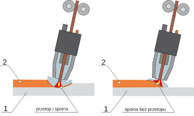 Rys. 1. Spawanie z przetopem MAG i lutospawanie MIG (BR) 1. łączony materiał, 2. spoina