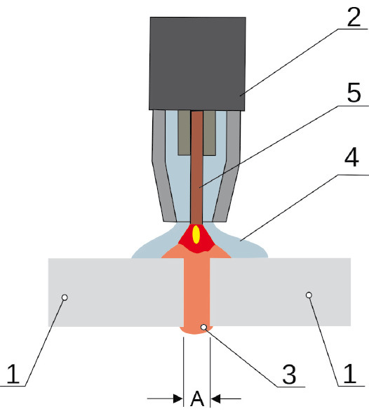 Rys. 2. Lutospawanie MIG (BR) 1. łączony materiał, 2. uchwyt spawalniczy, 3. spoina lutospawana, 4. chmura gazu, 5. spoiwo, A. przestrzeń do wpłynięcia spoiwa.