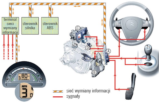 Zautomatyzowana skrzynia biegów ze sterowaniem elektrycznym (Citroën C3): A. sterownik skrzyni biegów B. silnik obsługujący sprzęgło; C. silnik wyboru i przełączania biegów; D.czujnik prędkości jazdy