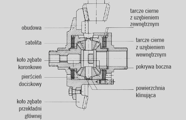Klasyczny mechanizm różnicowy: 1. wał wejściowy (atakujący); 2. korpus mechanizmu; 3. satelity; 4. koło koronowe półosi (jedno z dwóch)