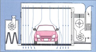 Każdy z wymienionych rodzajów kabin musi się odznaczać dobrą izolacyjnością termiczną i hermetyczną szczelnością. Pozwala to eliminować straty ciepła, niekontrolowany przepływ powietrza, przedostawanie się zanieczyszczeń z zewnątrz i wydostawanie się szkodliwych oparów z wnętrza. Poszycie ścian jest z reguły całkowicie szczelne, natomiast dodatkowych uszczelnień konstrukcyjnych wymagają wszystkie drzwi główne i pomocnicze oraz połączenia z instalacjami zewnętrznymi. W specjalnych kabinach do napraw częściowych stosuje się elastyczne uszczelnienia kurtynowe, stanowiące granicę naprawianej strefy nadwozia. Wszystkie wewnętrzne powierzchnie kabin powinny być pokryte powłokami matowo białymi, dającymi się łatwo zmywać, także po zabrudzeniu dowolnym rodzajem lakieru samochodowego. Do oświetlenia najlepiej nadają się jarzeniówki emitujące światło zbliżone barwą do dziennego. Ze względu na znaczną wilgotność powietrza (zwłaszcza przy korzystaniu z materiałów wodorozcieńczalnych) świetlówki powinny byĆ umieszczone w hermetycznych kloszach, otwieranych wyłącznie z zewnątrz kabiny. Z tych samych powodów nie należy we wnętrzu kabin korzystać z narzędzi elektrycznych. Zaleca się zastępować je sprzętem pneumatycznym. Wybór rodzaju energii wykorzystywanej do ogrzewania elektryczność, gaz, paliwa płynne) uwarunkowany jest głównie czynnikami ekonomicznymi. Z punktu widzenia technologii lakierniczych istotne jest, by ogrzewanie działało systemem nadmuchowym, zintegrowanym z wentylacją wnętrza. Cały obieg powietrza w kabinie jest wówczas wymuszony przez odpowiednio wydajną (od stu do trzystu całkowitych wymian powietrza na godzinę) dmuchawę zewnętrzną i otwarty od strony wylotowej. Stałe i płynne zanieczyszczenia powietrza atmosferycznego zatrzymywane są przez filtr wstępny, instalowany zwykle przed dmuchawą, co przeciwdziała szkodliwemu zapyleniu lub zawilgoceniu świeżych powłok lakierniczych. Między dmuchawą a wnętrzem kabiny instalowane są przepływowe wymienniki ciepła, podgrzewające nadmuchiwane powietrze do wymaganej temperatury. Za nimi instalowane są filtry dokładnego oczyszczania powietrza. |