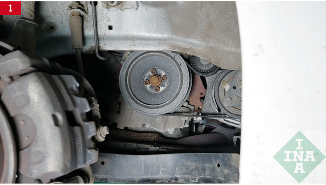 6. Luzujemy cztery śruby koła pasowego na wale korbowym (fot. 1), zdejmujemy pasek osprzętu, luzując napinacz paska, i demontujemy koło pasowe na wale korbowym.