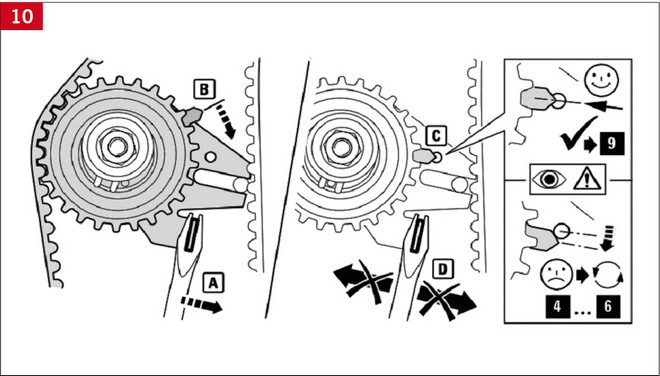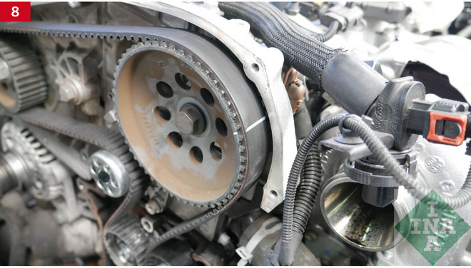 20. Blokujemy koło pasowe wału korbowego przyrządem blokującym i zakładamy pasek rozrządu na pozostałe komponenty układu w kierunku zgodnym z ruchem wskazówek zegara. Należy zwrócić uwagę, by oznaczenia na pasku (białe kreski) pokrywały się ze znakami na kole pompy paliwa, oraz na kołach wałka rozrządu i wału korbowego (fot. 7 i 8).