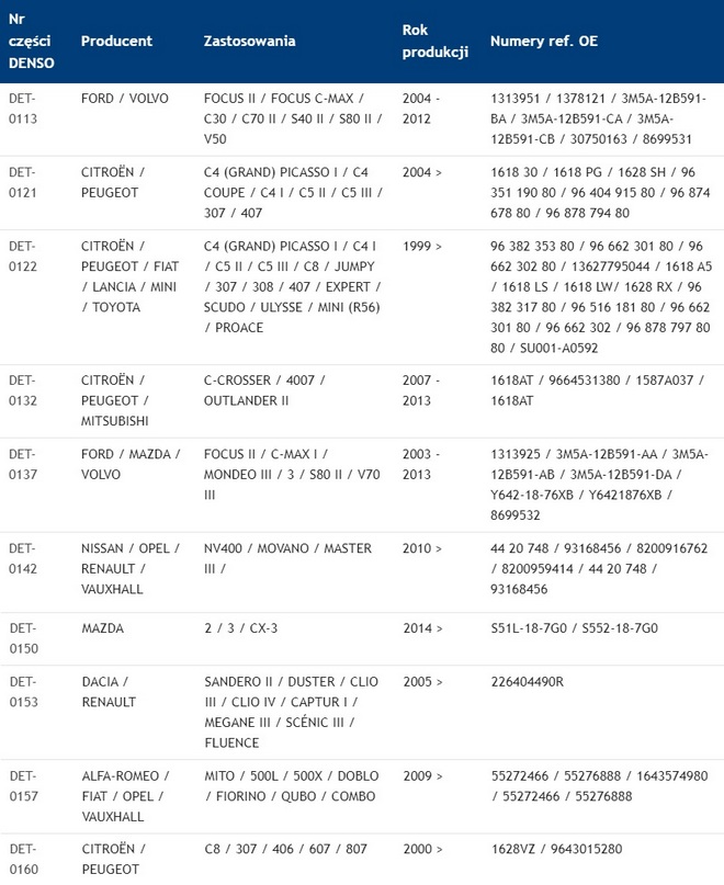 Czujniki mają 430 zastosowań i zastępują 49 numerów części OE. Mogą być montowane w ponad 12 mln pojazdów marek Citroën, Dacia, Fiat, Ford, Mazda, Nissan I Peugeot. Przykładowe zastosowania przedstawia tabela niżej.