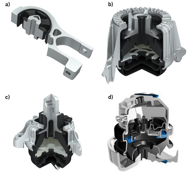 a – konwencjonalna poduszka silnika, b – pasywna poduszka hydrauliczna, c– aktywna poduszka sterowana podciśnieniem, d – Aktywna poduszka sterowana elektrycznie