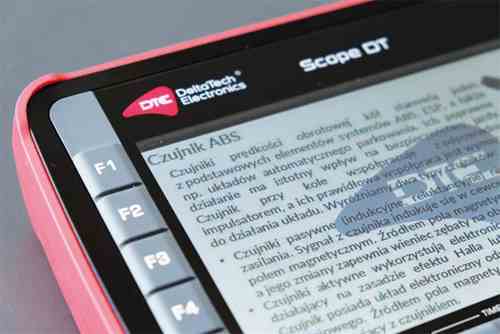 Instrukcja obsługi została wbudowana w urządzenie, więc zawsze znajduje się pod ręką. Przy pierwszych pomiarach warto korzystać z funkcji diagnoskopu, wybierając komponent z listy, np. czujnik ABS. Po jego aktywowaniu można dokonać pomiaru lub wyświetlić materiały związane z diagnostyką wybranego komponentu. Obejmują one informacje o jego funkcji, budowie, wariantach, a także wskazówki, jak interpretować sygnał wraz z przykładami przebiegów. Jeśli zdecydujemy się na pomiar, urządzenie ustawi odpowiednie wzmocnienia kanałów i podstawę czasu oraz wyświetli wskazówki, gdzie konkretnie podłączyć dane sondy pomiarowej. Wykonanie pomiaru za pomocą oscyloskopu nie może być prostsze.
