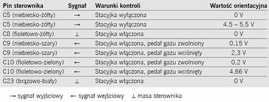 Włączyć zapłon, nacisnąć i zwolnić pedał. Wzrost i spadek wartości sygnału jest zależny od szybkości naciśnięcia i ponownego zwolnienia pedału
