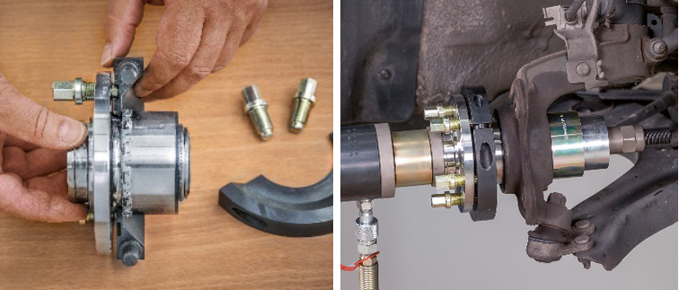 Naprawa łożysk kół generacji 2.1: specjalistycznie opracowane talerze narzędzia specjalnego umożliwiają przyłożenie siły przez pierścień zewnętrzny podczas procesu wciskania. Z drugiej strony pierścień zatrzaskowy jest umieszczony w taki sposób , że pasuje się w rowek przewidziany w zwrotnicy koła