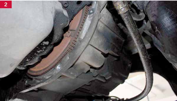 Demontaż rozpoczyna się od zdjęcia osłony silnika. Następnie odłącza się przewody filtra powietrza oraz zdejmuje jego obudowę i podstawę. Rozłączenia wymagają też wielostykowe złącza instalacji elektrycznej. Należy wyjąć pomocniczą skrzynkę bezpiecznikową, co umożliwi lepszy dostęp do górnej części skrzyni biegów. W dalszej kolejności odłącza się cięgna zmiany biegów usytuowane w górnej części skrzyni od mechanizmu zmiany biegów. Dopiero teraz możliwe jest wymontowanie całego podzespołu. Następnie wyjmuje się siłownik sprzęgła i mocuje go opaską zaciskową po jednej stronie skrzyni (fot. 1). Odłączenie przewodu hydraulicznego nie jest konieczne. W dalszej kolejności należy wymontować rozrusznik, górne śruby pokrywy sprzęgła oraz zamocowanie i wspornik skrzyni biegów. Należy wypiąć złącza wielostykowe świateł cofania i prędkościomierza.