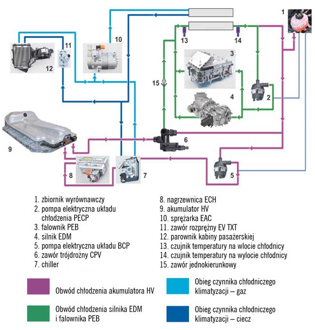 Obwód przeznaczony dla akumulatora HV ogranicza jego temperaturę do 40°C. W obwodzie tym znajduje się nagrzewnica elektryczna ECH (rys. 1, poz. 8) oraz chiller (rys. 1, poz. 7) – wymiennik ciepła między płynem chłodzącym a czynnikiem chłodniczym obwodu klimatyzacji.