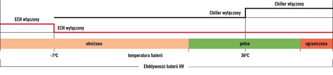 Układ chłodzenia ogrzewa kabinę pasażerską (w tym przypadku nagrzewnica PTC) i utrzymuje optymalną temperaturę głównych elementów układu wysokiego napięcia: