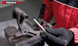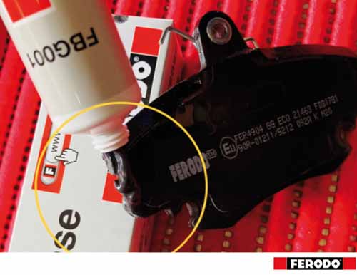 Po oczyszczeniu zacisków hamulcowych, a przed zamontowaniem klocków, należy nałożyć na wybrane miejsca niewielką ilość smaru hamulcowego (np. smaru do hamulców Ferodo®). Środek ten trzeba zaaplikować bardzo precyzyjnie – ma trafić wyłącznie na punkty tarcia metal-metal na tylnej powierzchni klocków. Nie wolno zanieczyścić nim ani zewnętrznej części zacisku, ani powierzchni ciernej klocka.