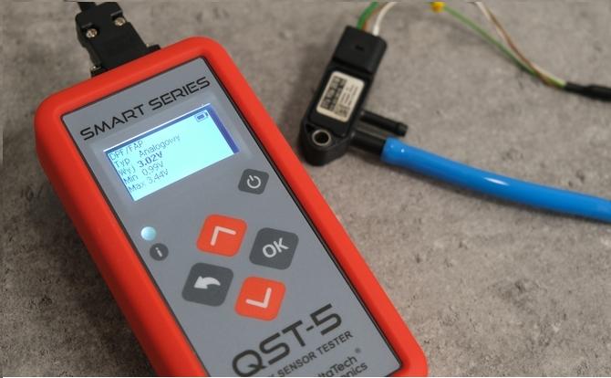 Przy testowaniu tego typu czujników trzeba pamiętać, że zbyt wysokie ciśnienie może je uszkodzić. Do testu wykorzystamy tester czujników QST-5, który umożliwia łatwe podłączenie nawet bez znajomości wyprowadzeń. Dodatkowo zapewnia on zasilanie czujnika oraz odczyt wartości mierzonej w trakcie testu. Zadając odpowiednie ciśnienie i obserwując wskazania, stwierdzamy poprawne działanie czujnika (fot. 1).