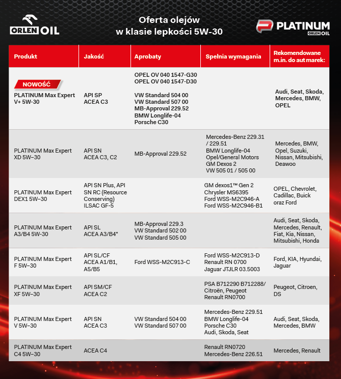 W związku z zapotrzebowaniem współczesnego rynku motoryzacyjnego na środki smarne do silników projektowanych zgodnie z ideą dowsizingu do oferty Orlen Oil został wprowadzony nowy olej Platinum Max Expert LL 0W-20. Jest to najnowszej generacji, w pełni syntetyczny, wielosezonowy olej silnikowy typu LongLife, w klasie lepkości 0W-20 i jakości ACEA C5, API SN Plus. Wyprodukowany w technologii Mid SAPS (obniżona zawartość popiołu siarczanowego, siarki i fosforu), dzięki czemu zapewnia doskonale parametry, redukuje ryzyko zużycia zaworów, zapewniając jednocześnie lepszą kontrolę osadów i gwarantuje dobrą czystość silnika. Przeznaczony jest do nowoczesnych jednostek benzynowych i Diesla, w których zastosowano nowoczesne systemy oczyszczania spalin (DPF i GDF), spełniające normy emisji Euro 6.
