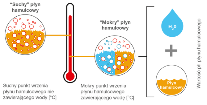 Temperatura wrzenia płynu hamulcowego to temperatura, przy której zaczynają tworzyć się pęcherzyki gazu. Gdy tylko dojdzie do powstania pęcherzyków gazu, utrzymanie wymaganego ciśnienia roboczego w układzie hamulcowym jest niemożliwe, ponieważ gaz daje się sprężać. Skutkiem jest gwałtowny spadek skuteczności siły hamowania, co może prowadzić do wypadku.