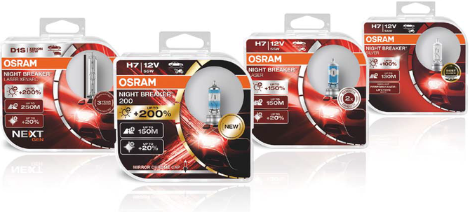 Portfolio oświetlenia halogenowego Night Breaker to aż trzy różne modele – Silver, Laser i Night Breaker 200. Liczba w nazwie tych ostatnich nie jest przypadkowa – oznacza, że żarówki świecą światłem nawet do 200% jaśniejszym niż określa minimum homologacyjne. Droga przed samochodem jest oświetlona znacznie dalej, nawet do 150 m przed podjazdem. Żarówki charakteryzują się także światłem bielszym do 20% w porównaniu z wymaganiami normy ECE R112/R37. Night Breaker 200, najjaśniejsze żarówki halogenowe w ofercie, występują w typach H4, H7 i od niedawana także H11.