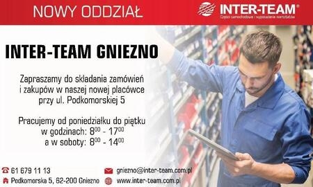 Firma Inter-Team informuje, że dzisiaj rozpoczął działalność nowy oddział sprzedażowy w Gnieźnie przy ul. Podkomorskiej 5. Jest to 7. oddział tej spółki w Wielkopolsce i 87. w Polsce.