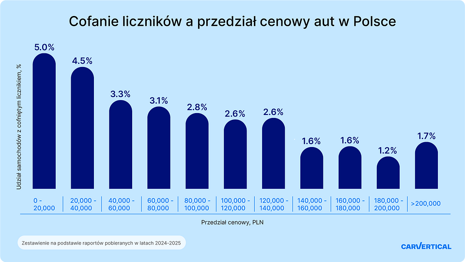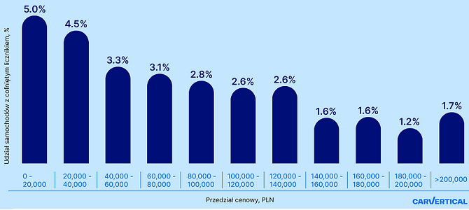 W swoim raporcie firma carVertical podzieliła samochody na grupy cenowe. Okazało się, że dla rynku polskiego wskaźnik ujawnionych cofnięć liczników był najwyższy w grupie pojazdów najtańszych (poniżej 20 tys. zł) i wynosił 5%. Analogiczne wskaźniki w innych grupach to 4,5% dla aut w cenie od 20 do 40 tys. zł i 3,3% dla tych z przedziału od 40 do 60 tys. zł. Podobną tendencję obserwuje się także na rynkach w innych krajach i wszędzie najwięcej oszustw związanych z przebiegiem ujawnia się w grupie pojazdów najtańszych.