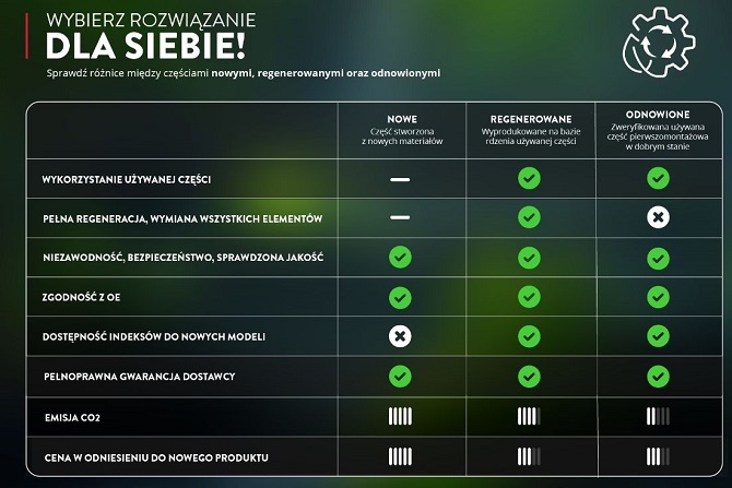 Tabela z porównaniem części nowych, regenerowanych i odnowionych