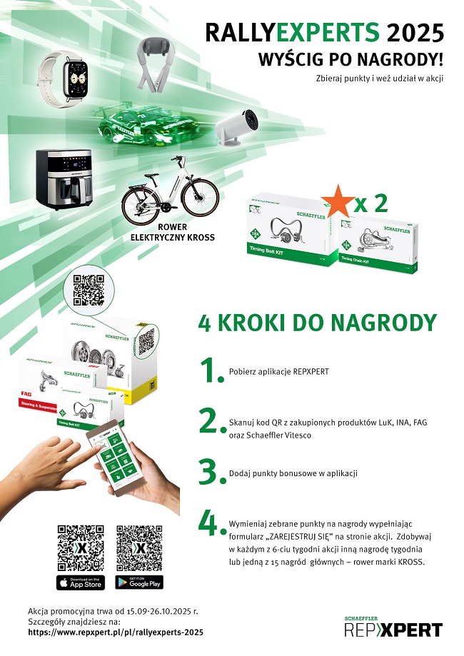 Szczegółowe zasady dotyczące RallyExperts dostępne są w regulaminie na stronie www.repxpert.pl/pl/rallyexperts-2025 oraz na profilu Facebook Schaeffler REPXPERT Polska.