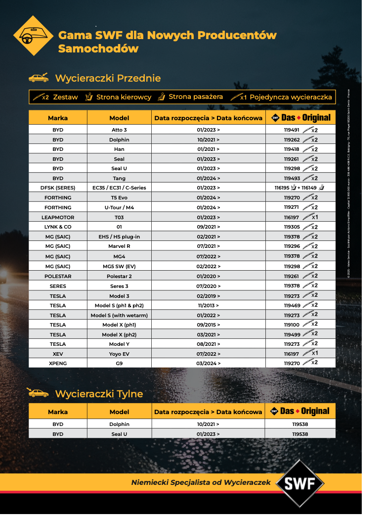 Nie każdy w branży ma informacje na temat szerokiego pokrycia jakie zapewnia portfolio wycieraczek SWF dla pojazdów nowych marek, w szczególności dla chińskich producentów samochodów elektrycznych. Tymczasem ich udział w europejskim parku samochodowym dynamicznie rośnie. Co istotne, część z tych producentów nie posiada własnej sieci serwisów autoryzowanych, co sprawia, że obsługa posprzedażowa jest w pełni otwarta dla niezależnego rynku.