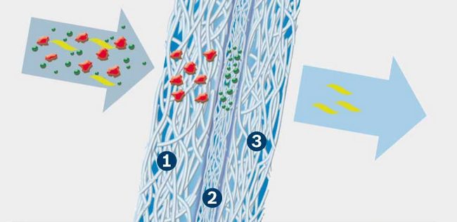 Przekrój standardowego filtra kabinowego Bosch: 1. filtr wstępny zatrzymuje największe cząstki pyłów i brudu; 2. mikrowłóknina oddziela pyłki roślin i bakterie; 3. warstwa wzmacniająca zapewnia optymalny kształt filtra i jego stabilne zamocowanie