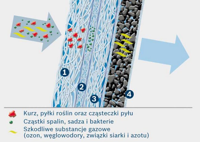 Przekrój filtra kabinowego Bosch z węglem aktywnym: 1. filtr wstępny zatrzymuje największe cząstki pyłów i brudu; 2. mikrowłóknina oddziela pyłki roślin i bakterie; 3. warstwa wzmacniająca zapewnia optymalny kształt filtra i jego stabilne zamocowanie; 4. węgiel aktywny separuje nieprzyjemne zapachy i szkodliwe substancje gazowe