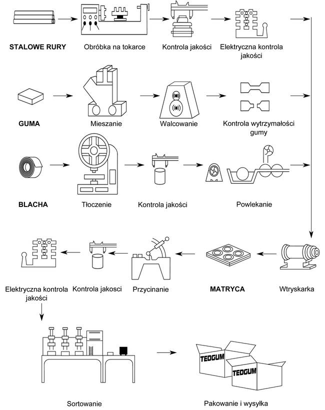 Proces wulkanizacji elementów metalowo-gumowych przebiega następująco: mieszanka gumowa w stanie płynnym zostaje wtłoczona do matrycy, w której nabiera kształtu danego wyrobu. Warunkiem dobrej jakości wyrobu jest spełnienie poniższych wytycznych: