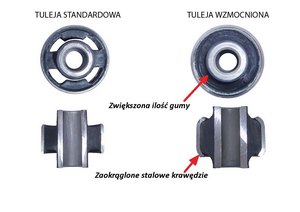 Kolejnym czynnikiem wpływającym na koszty napraw jest sposób ich wykonania. Najczęściej w związku z fabrycznymi ograniczeniami konstrukcyjnymi trzeba wymienić cały kompletny element. Jest to rozwiązanie wygodniejsze i szybsze, lecz niekoniecznie tańsze. Czasem jednak warta rozważenia okazuje się możliwość wymiany samych uszkodzonych części tegoż elementu. W przypadku pojazdów eksploatowanych w trudnych warunkach drogowych, powodujących przyspieszone zużycie zawieszeń, opłacalne bywa zastąpienie oryginalnych tulei metalowo-gumowych ich konstrukcjami wzmocnionymi. Na zamieszczonych zdjęciach widoczne są różnice pomiędzy produktami wzmocnionym a standardowymi.
