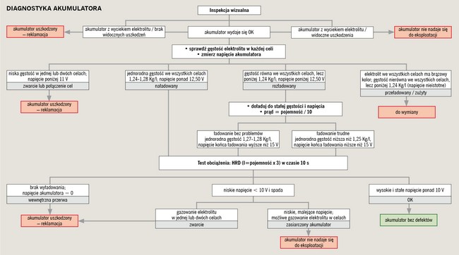 Henryk Przybyło, Autopart Mielec (na zdjęciu): Testowanie akumulatora jest możliwe wtedy, gdy dysponujemy niezbędnymi przyrządami. Absolutne minimum to woltomierz cyfrowy, areometr i urządzenie (tester), za pomocą którego będziemy w stanie obciążyć akumulator prądem równym trzykrotnej wartości jego pojemności (dla akumulatora o pojemności 60 Ah wartość natężenia wynosi 180 A). Zasady testowania i sposób przeprowadzania badań przedstawia diagram poniżej. Diagnozowanie rozpoczynamy od kontroli wyglądu, czyli sprawdzenia obecności ewentualnych wycieków elektrolitu. Jeżeli znajdziemy takie usterki, akumulator nie nadaje się do użytku. Kolejny krok to pomiar gęstości elektrolitu w każdej celi i kontrola napięcia na końcówkach biegunowych.