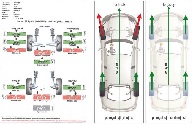 Rysunek nr 2 (po prawej) przedstawia nieprawidłowe ustawienie kół zarówno tylnej, jak i przedniej osi. Odchylenie toru jazdy (kąt znoszenia) znacznie przekracza wartości wynikające z tolerancji. Rysunek nr 3 to wydruk pomiarów rzeczywistego pojazdu, dla którego kąt znoszenia wynosi 0-05’ (koła są tu ustawione trochę inaczej niż na ilustracji nr 2).