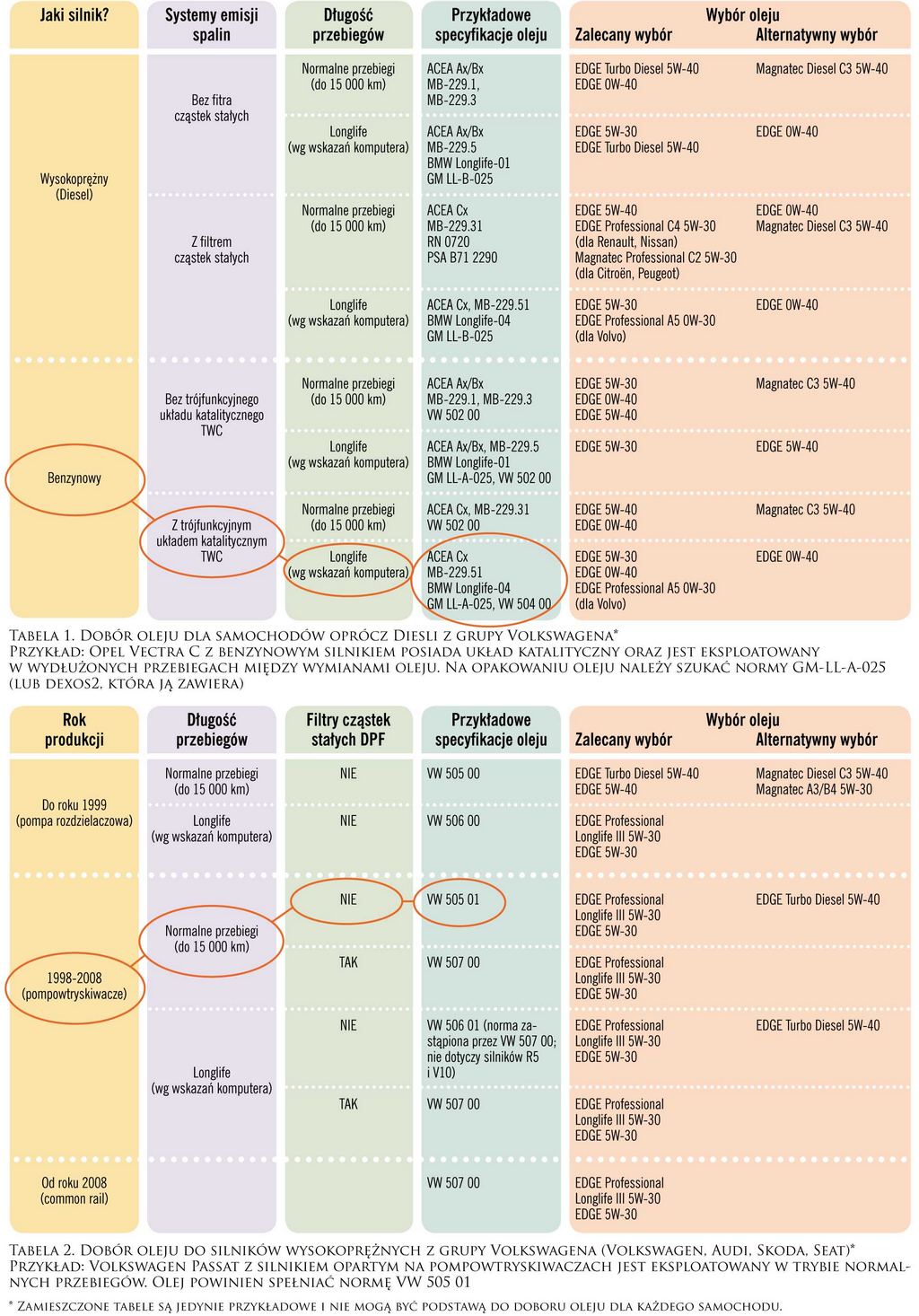 Dla przykładu przeanalizujemy dwa auta często występujące na polskim rynku: Opel Vectra C 1.8 16V z 2003 roku (z longlife) i Volkswagen Passat 1.9 TDI z 2004 roku (bez longlife). Opel ma silnik benzynowy z dozwolonym trybem wydłużonych przebiegów, maksymalnie do 30 tys. km. Normą, jakiej powinien odpowiadać olej do tego silnika, jest GM-LL-A-025, zawierająca się w normie dexos2. Spełnia ją np. olej Castrol EDGE 5W-40. Volkswagen ma silnik wysokoprężny z pompowtryskiwaczami, bez filtra DPF i wydłużonych cykli serwisowych. Olej do niego musi spełniać normę VW 505 01, więc może nim być Castrol EDGE Turbo Diesel 5W-40. Norma 507 00 zawiera w sobie normę VW 505 01, co oznacza możliwość używania także oleju Castrol EDGE 5W-30.