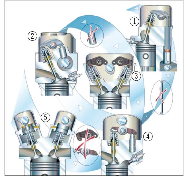 W okresie upowszechniania się hydraulicznej regulacji luzów zaworowych nastąpił rozwój konstrukcji samych układów rozrządu. Zasada hydraulicznej kompensacji pozostawała więc niezmienna, lecz znacznie różniły się jej praktyczne zastosowania w konkretnych modelach silników. Widać to wyraźnie na ilustracji zatytułowanej „Konstrukcje mechanizmu zaworowego” (rys. 2), gdzie pokazano kolejno układy: