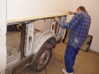 Nową część poszycia trzeba po stronie wewnętrznej, na krawędzi styku ze starą, oczyścić szlifierką z warstwy kataforezy, a od strony zewnętrznej okleić ją taśmą malarską, aby nie przywierał do niej nadmiar kleju z formowanej spoiny. Takiego samego przygotowania wymaga zewnętrzna powierzchnia wspomnianej odsadzki z tym, że zabezpieczenie taśmą malarską umieszcza się na sąsiadującej z nią wierzchniej części starego poszycia.