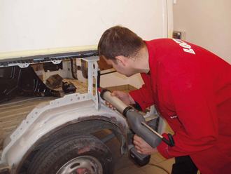 Natomiast przy wymianie tego samego elementu metodą klejenia czas wykonania całej operacji jest nieporównywalnie krótszy, a jakość lepsza. Naprawę rozpoczyna się wówczas od wycięcia uszkodzonego fragmentu poszycia zewnętrznego i dopasowania na jego miejsce nowej części. Cięcie powinno omijać miejsca wytłoczeń wzmacniających, ponieważ nowe połączenie krawędzi wykonuje się z zastosowaniem tzw. odsadzki, czyli na uformowaną specjalnymi kleszczami zakładkę, zapewniającą licowanie łączonych elementów.