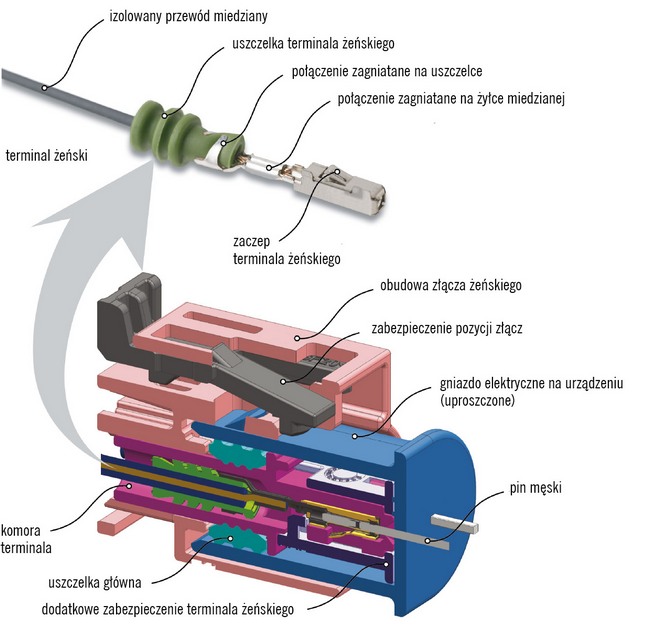 Dla lepszego zrozumienia istoty tego problemu warto raz jeszcze przyjrzeć się budowie typowego samochodowego złącza elektrycznego, widocznego na załączonym poniżej rysunku, i przeanalizować funkcje jego elementów. Generalnym powodem zmian w konstrukcji złącz jest dążenie producentów pojazdów do redukcji ich masy i kosztów wytwarzania. Pociąga to za sobą postępującą miniaturyzację niektórych komponentów oraz wprowadzanie nowych materiałów. W zakresie instalacji elektrycznych jednym z głównych trendów jest teraz zmniejszanie przekroju przewodów sygnałowych z 0,50 i 0,35 mm2 do 0,18 i 0,13 mm2. W konsekwencji doprowadza to do powstawania nowych terminali i nowych złącz o znacznie zmniejszonych odległościach między terminalami (2,0 lub 1,8 mm zamiast z 2,54 mm) i mniejszych gabarytach.