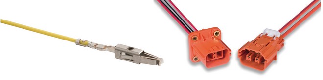 Z lewej: zacisk typu L-Shape crimp na przykładzie terminala DSQ 1.5 i kabla o przekroju 0,13 mm; z prawej: przykład złącza z wbudowanym HVIL