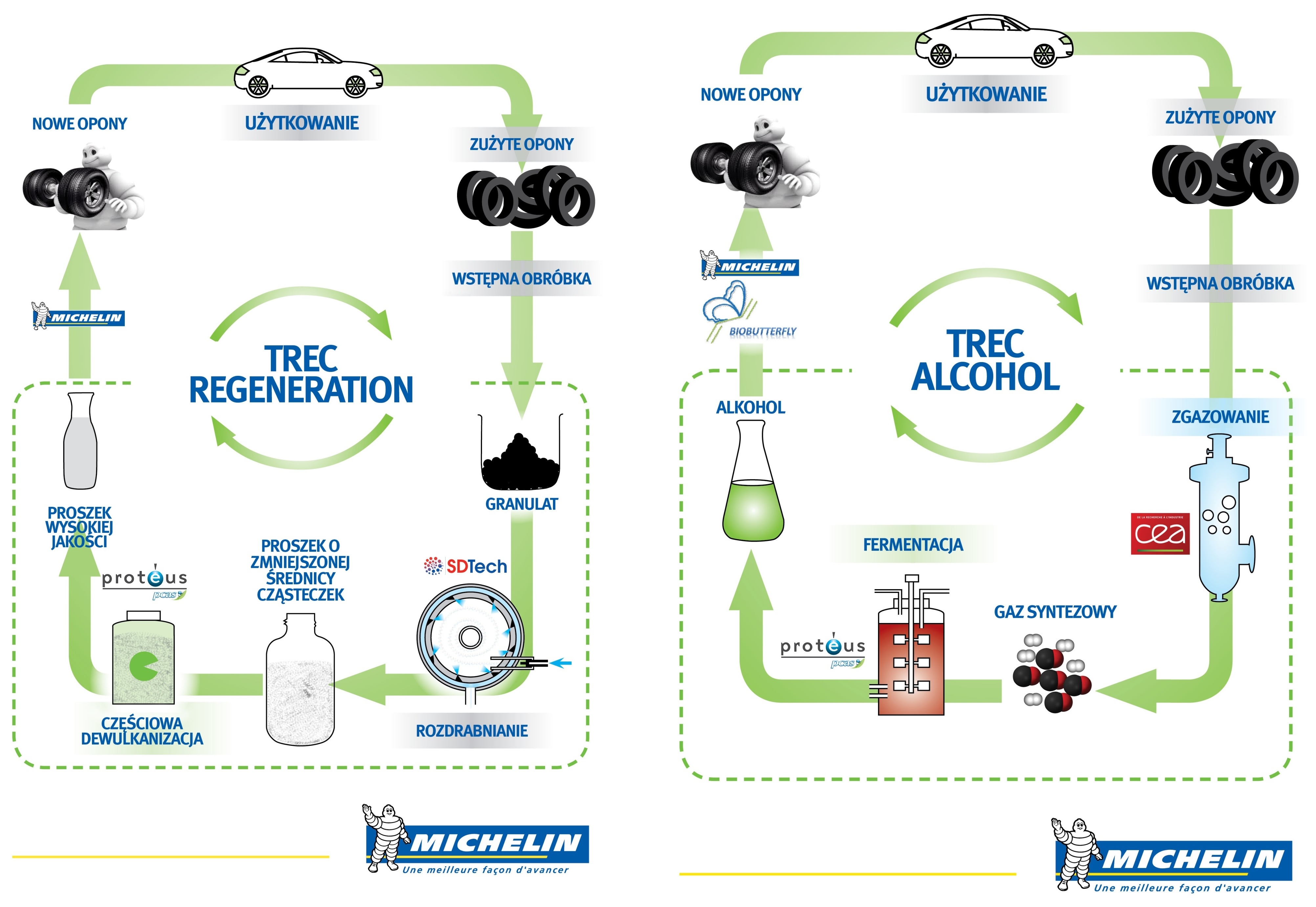 Istotą pierwszej z nowych technologii (TREC Regeneration) jest regeneracja mieszanki gumy i uzyskiwanie z niej nowej opony: zużyte gumy zamieniają się w proszek wykorzystywany następnie do produkcji opon o wysokich osiągach. Drugi metoda (TREC Alcohol) pozwala przetworzyć stare ogumienie w alkohol używany w procesie produkcji opon.