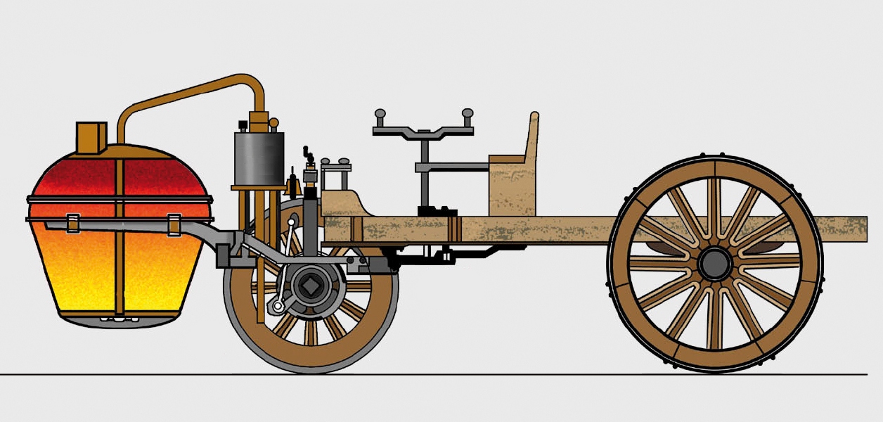 Był właśnie rok 1769, w którym inżynier Nicolas-Joseph Cugnot, po czteroletnich pracach konstruktorskich, zdecydował się odbyć pierwszą w dziejach światowej techniki, parokilometrową podróż pojazdem bez koni. I oto trójkołowy, drewniany wehikuł rzeczywiście sunie środkiem drogi z prędkością piechura, buchając kłębami pary ze swych dwóch mosiężnych cylindrów, a dumny wynalazca siedzi na wysokim koźle i utrzymuje kierunek jazdy korbą sprzężoną z przednim napędzanym kołem.