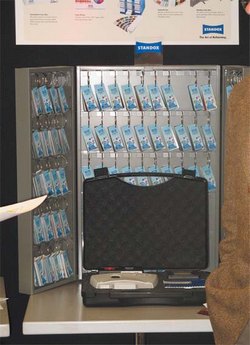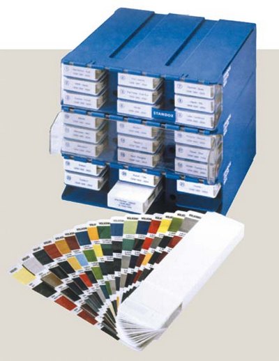 Systemowe mieszarki służą do łączenia tych składników według określonych receptur zawierających wagowe proporcje ich składników. Podstawowymi ich częściami są więc precyzyjne wagi, wyskalowane z dokładnością do jednego grama, mechaniczne mieszadła z nastawnymi wyłącznikami czasowymi oraz kartoteki opracowanych wariantów kolorystycznych. Ze względu na wymaganą precyzję wskazań waga nie może znajdować się w miejscu narażonym na wibracje, na przykład w pobliżu mieszalników, sprężarek, wentylatorów itp. Kartotekę mogą tworzyć karty uporządkowane według systemu kodowych oznaczeń odcieni bądź mikrofilmy, których klatki, odpowiadające poszczególnym odcieniom, wyświetlane są na specjalnym czytniku, lub też zapisy elektroniczne na płytach CD. Każde urządzenie mieszające dostosowane jest wyłącznie do lakierów jednego producenta, będącego zarazem dostawcą całego systemu. Wchodzące w skład zestawu naczynia z lakierami podstawowymi różnią się wielkością stosownie do statystycznej częstotliwości i udziału poszczególnych barw w praktycznie wykorzystywanych materiałach. Wstępna identyfikacja kolorów i odcieni W dokumentacji systemów lakierniczych próbkom dostarczanym przez producentów pojazdów odpowiadają receptury oznaczane kodami oryginalnych powłok fabrycznych. Dla identyfikacji danego koloru należy więc najpierw odszukać według odpowiedniej listy referencyjnej numer właściwego próbnika i porównać oznaczony nim wzorzec z lakierem naprawianego nadwozia. Dane opracowane przez producentów lakierów są zwykle pod tym względem bogatsze niż informacje podawane przez producentów samochodów. Poszczególnym nazwom i kodom kolorów może w nich odpowiadać kilka ewentualnych odcieni, np. podstawowy, jaśniejszy i ciemniejszy. Do identyfikacji używa się wszystkich tych próbników. Jeśli efekty nie są zadowalające, trzeba szukać rozwiązania, korzystając z próbników sąsiednich w danym systemie. Poza tym większość producentów lakierów sporządza jeszcze próbki dodatkowe, nazywane niuansami i opisywane w formie poprawek do koloru pierwotnego, jako np.: jaśniejsze, bardziej nasycone, z drobniejszym lub grubszym ziarnem dodatku metalicznego itp. Można też korzystać z firmowych wzorców archiwizowanych w porządku chromatycznym. Każdemu takiemu wzornikowi również odpowiada receptura proporcji składników dostarczanych przez danego producenta. W praktyce pozwala to na zadowalający dobór koloru aż w 90% przypadków, w pozostałych zaś dostarczają propozycji możliwych do zaakceptowania przy zastosowaniu tzw. cieniowania brzegów strefy naprawianej lub drobnych korekt receptury. |