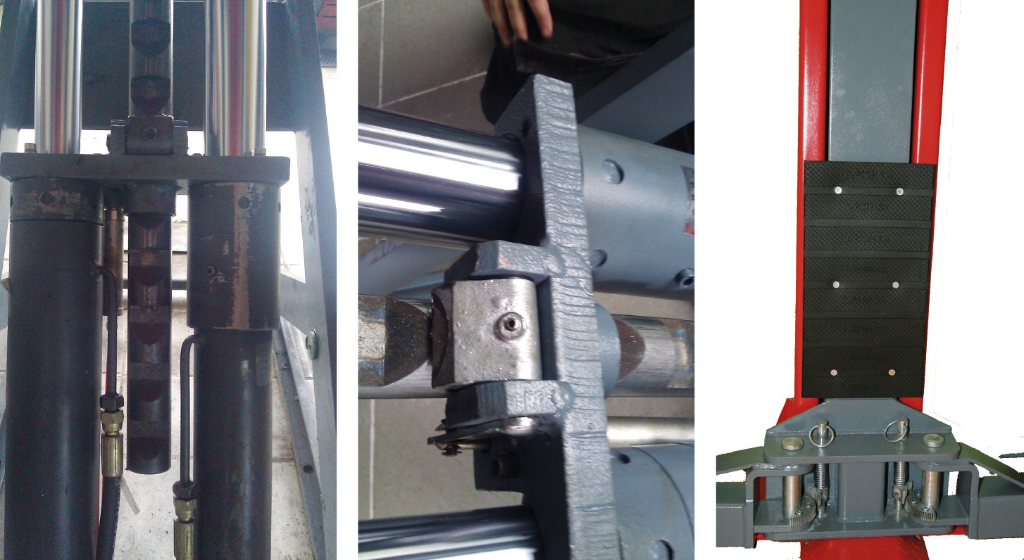 Z lewej: mechanizm blokujący pozycję ustawienia ramion podnośników dwukolumnowych. Z prawej: ograniczniki dostępu stosowane są w podnośnikach z ramionami unoszącymi, aby nie groziły zgnieceniem stopy w trakcie opuszczania