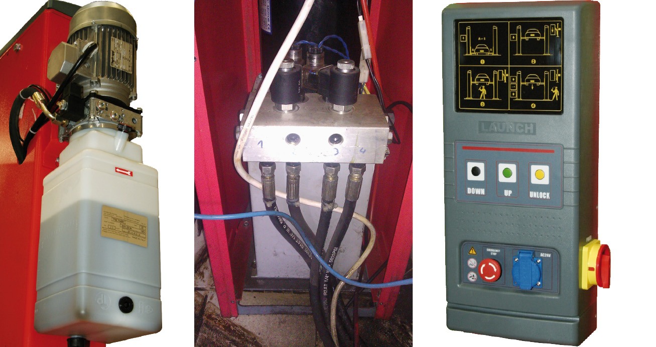 W warsztatowych podnośnikach samochodowych wymagane jest sterowanie unoszenia napięciem bezpiecznym o wartości 24 V. Sterowanie podnośnika musi eliminować sytuacje niebezpieczne, poprzez uniemożliwienie jednoczesnego załączania przeciwnych kierunków ruchu jakiegokolwiek mechanizmu oraz zabezpieczenie przed przypadkowym uruchomieniem napędu.
