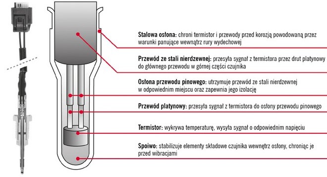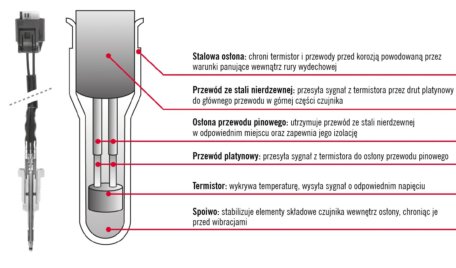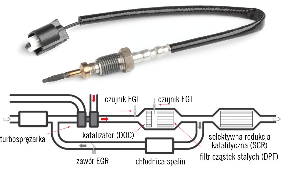 Czujnik temperatury odprowadzanych spalin EGT instalowany jest w układzie wydechowym przed katalizatorem utleniającym (DOC) i/lub przed filtrem cząstek stałych (DPF). Mierzy on temperaturę odprowadzanych gazów i przesyła informację o niej w postaci elektrycznego sygnału do modułu sterującego silnika. Wpływa to na taką pracę silnika, przy której skutecznie zmniejsza się emisja szkodliwych składników spalin.