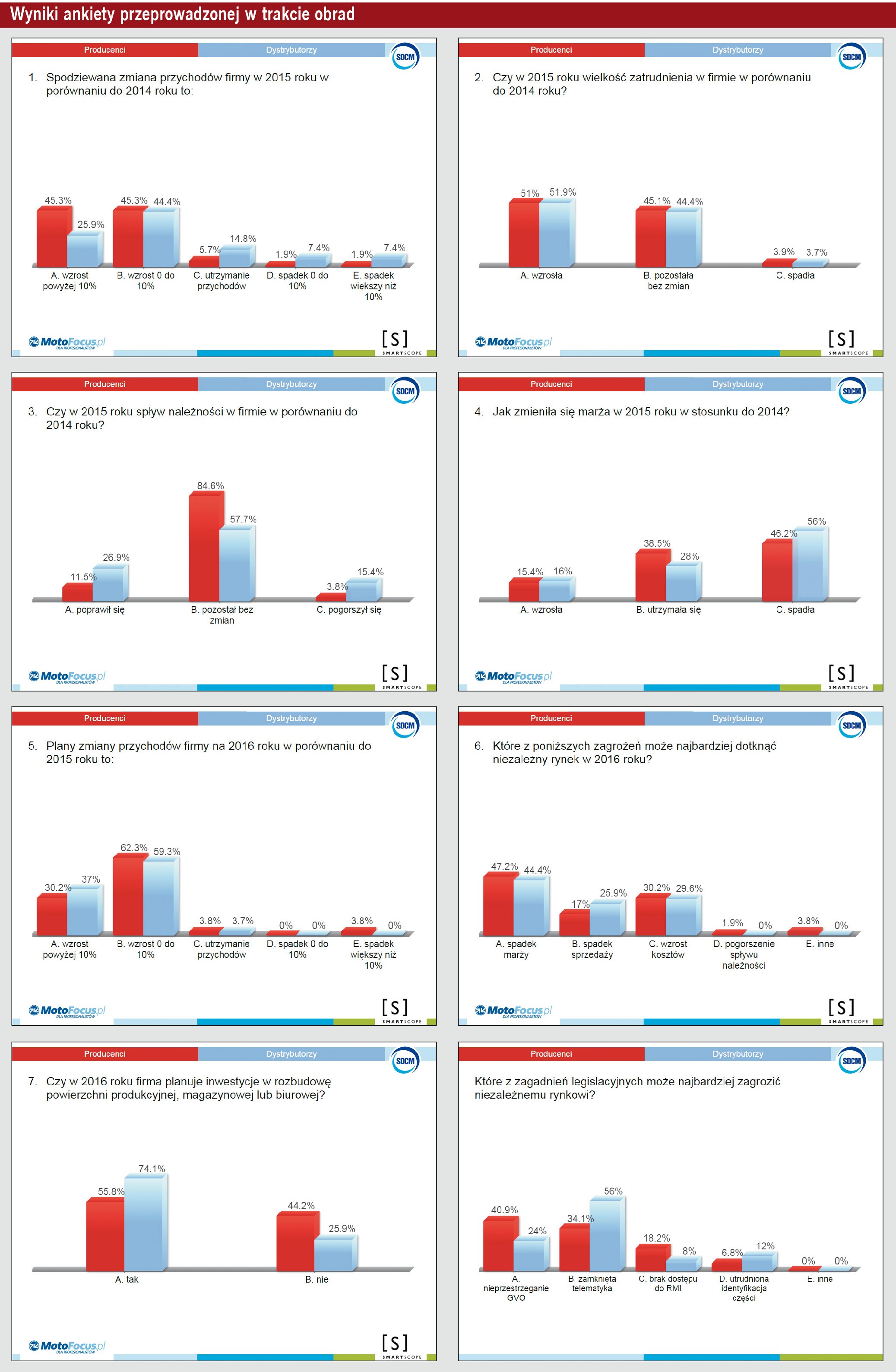 W trakcie wystąpienia Alfreda Franke i Tomasza Dulinicza przeprowadzono interaktywną ankietę wśród zgromadzonych gości. Wykazała ona m.in., że 62,3% producentów i 58,3% dystrybutorów przewiduje w roku 2016 kilkuprocentowy wzrost swych przychodów w stosunku do roku bieżącego, a 30,2% producentów i 37% dystrybutorów ma nadzieję na poprawę ponad dziesięcioprocentową. W związku z tym aż 74,1% dystrybutorów części i 58,5% producentów zadeklarowało w roku 2016 nowe inwestycje w obiekty produkcyjne, magazynowe lub biurowe. Nieco ponad 50% ankietowanych odnotowało w 2015 roku zwiększenie zatrudnienia w swych firmach (spadek tylko niespełna 4%). Średnio połowa producentów i dystrybutorów odnotowała w analizowanym okresie spadek uzyskiwanej marży, podczas gdy jej wzrost dotyczył nieco ponad 5% respondentów. Także prawie połowa ankietowanych największe zagrożenie dla swego rozwoju upatrywała w dalszym spadku marży. Osobne pytanie dotyczyło obaw związanych z ewentualnymi niekorzystnymi dla niezależnego rynku regulacjami legislacyjnymi i tutaj najczęściej wskazywano tworzenie zamkniętych systemów telematycznych oraz naruszenia zasad GVO przez producentów samochodów. Z ankiety wynika również, że producenci części inwestują 8–10% swoich przychodów w badania i rozwój.