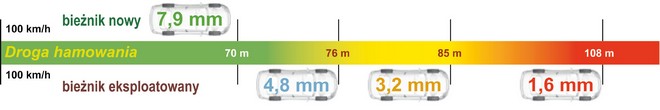 Rys. 11 Zależność długości drogi hamowania od głębokości bieżnika opony