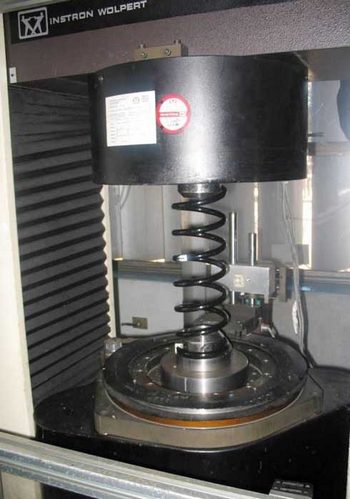 | U góry: sprężyny "miniblock", u dołu: próba zmęczeniowa sprężyny standardowej w laboratorium wytrzymałościowym |