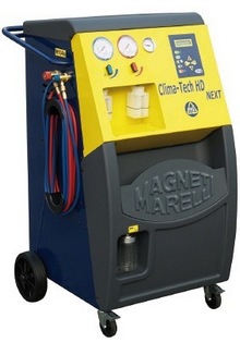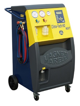 Stacje marki Magneti Marelli (seria Next) serwisuje się co 60 godzin pracy pompy próżniowej w zakresie sprawdzenia/wymiany oleju, wymiana filtra osuszacza następuje po przefiltrowaniu każdych 150 kg czynnika chłodniczego.